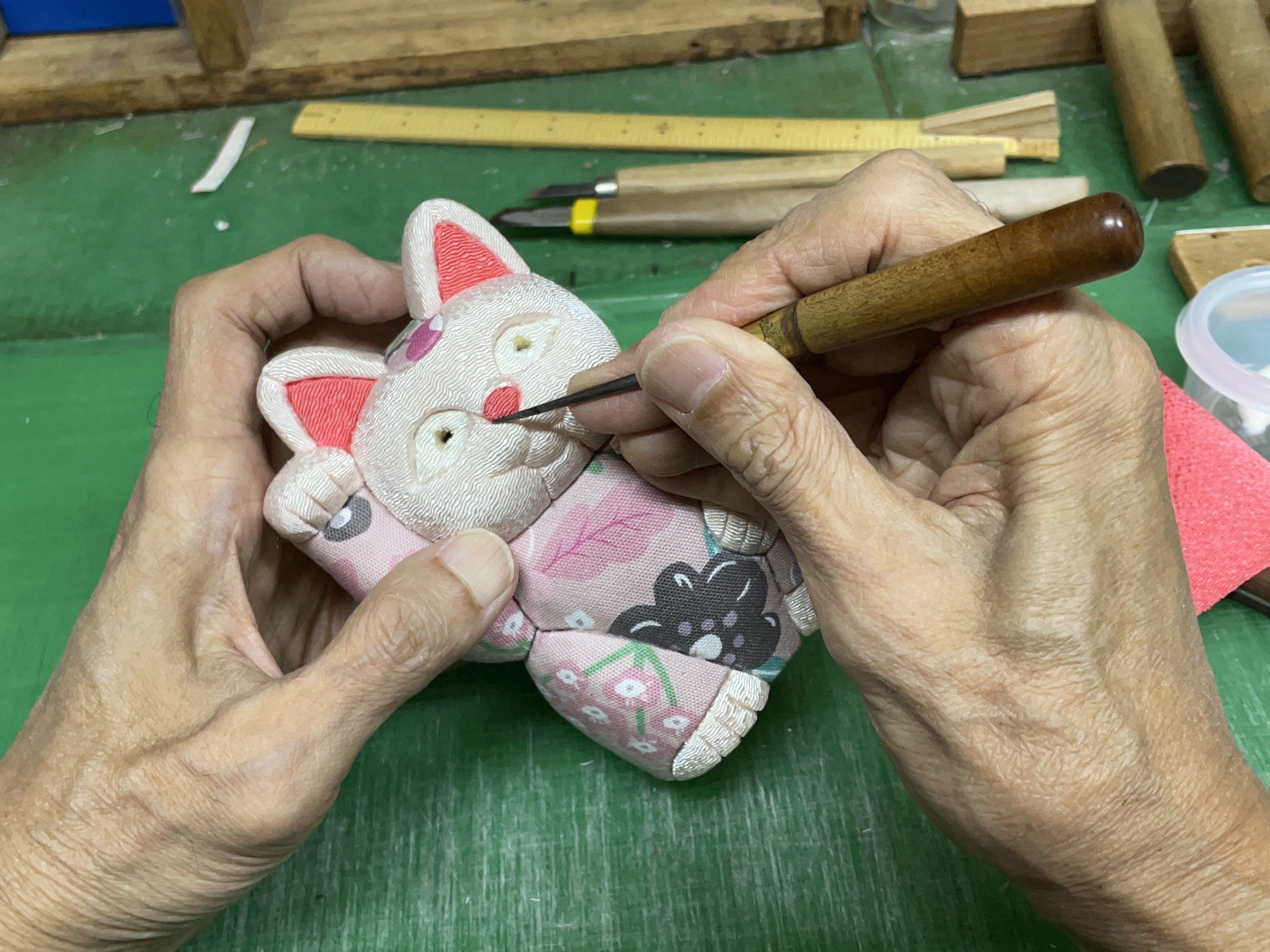 筋(溝)を掘った木目込人形のボディに布を木目込む作業をお願いしております。